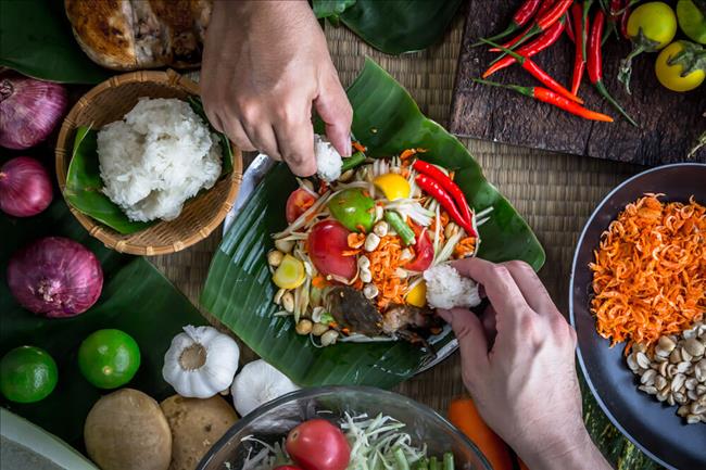 Similar to Ahan Lanna, Ahan Isan (Northeastern Thai food) draws hints of Lao culture, substituting jasmine rice for glutinous rice as their staple food. Another notable distinction of Instead of curries and thick broths that are synonymous with cuisines from other regions, Northeastern Thai food relies on fresh savoury salads to accompany their main dishes. Dishes unique to this region include Som Tum (papaya salad), Nam Tok (sliced grilled meats) and Gai Tod (fried chicken).